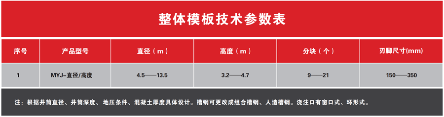主体:圆弧钢板焊接成的单缝式刚性圆筒,结构稳固。部件:含刃脚防漏浆,关键为液压脱模装置。